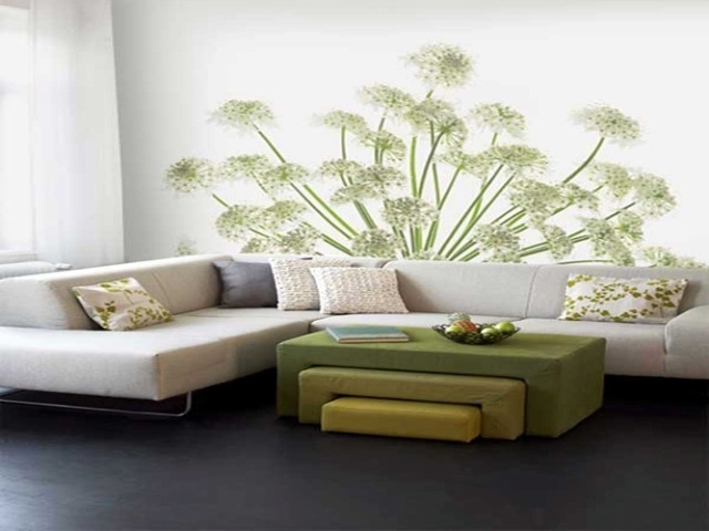 Giấy dán tường là một giải pháp hợp lý và thuận lợi để tô điểm cho các không gian nội thất vì nó phong phú sắc màu và đa dạng về họa tiết. Trong ảnh là phòng sinh hoạt chung của gia đình với bức tranh bãi biển trải dài xanh ngắt, giúp không gian trở nên rộng rãi, sinh động hơn.